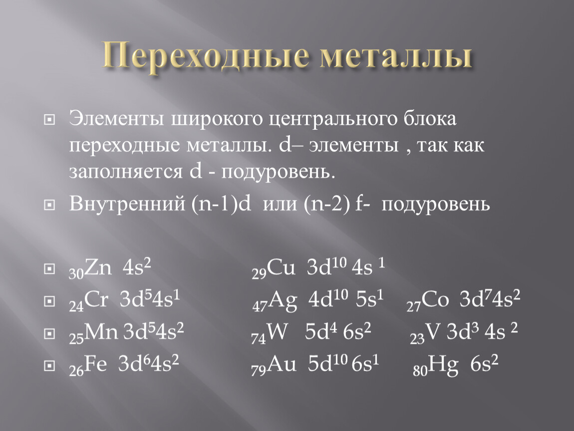 Элементы широкого центрального блока переходные металлы. d– элементы , так как заполняется d - подуровень.