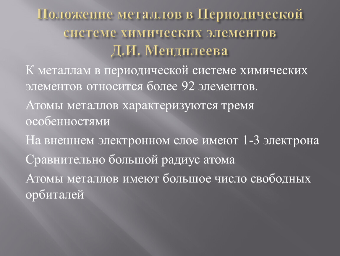 К металлам в периодической системе химических элементов относится более 92 элементов.