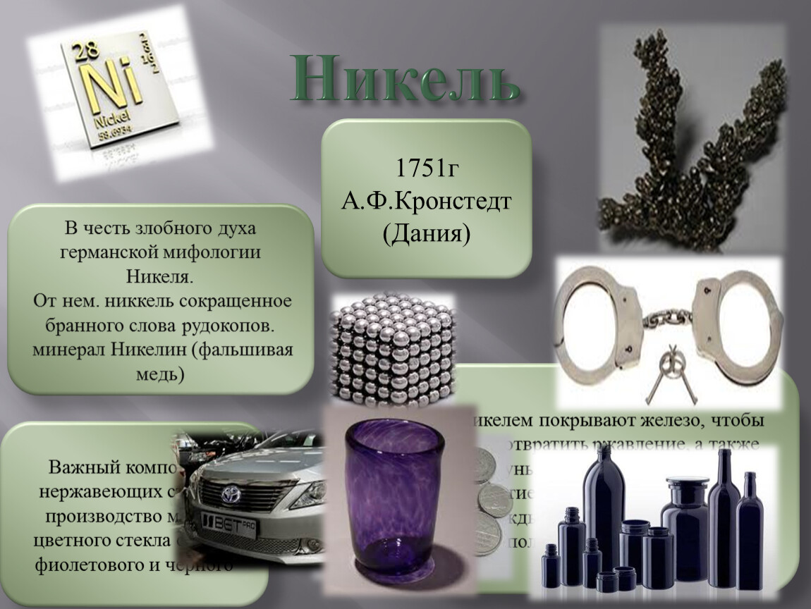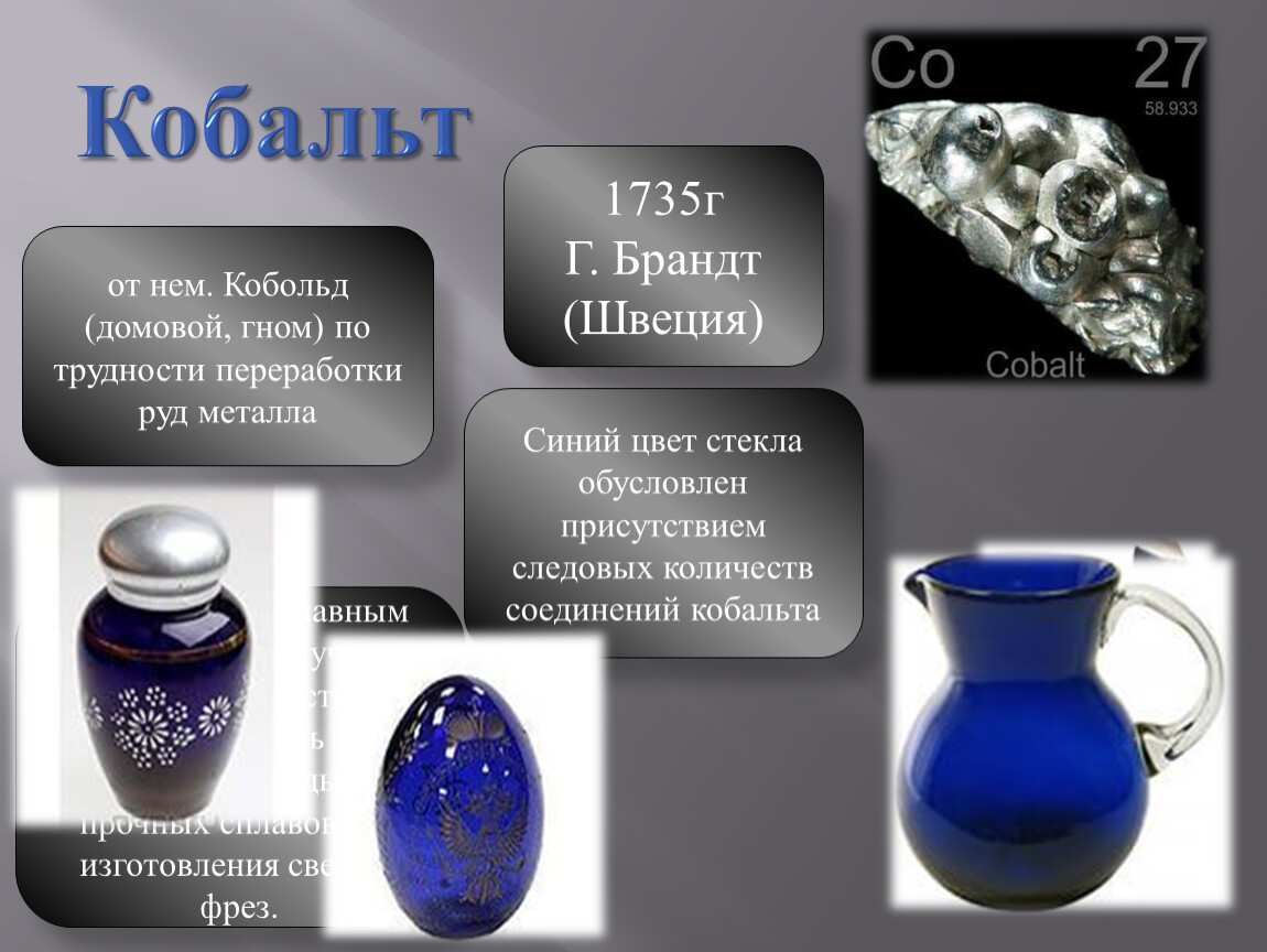 Важный компонент нержавеющих сталей, производство монет, цветного стекла синего фиолетового и черного