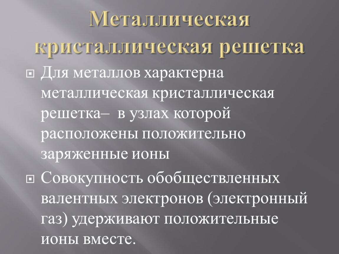 Для металлов характерна металлическая кристаллическая решетка– в узлах которой расположены положительно заряженные ионы