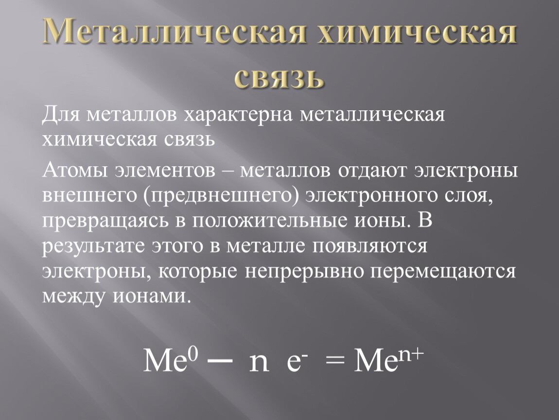 Атомы элементов – металлов отдают электроны внешнего (предвнешнего) электронного слоя, превращаясь в положительные ионы. В результате этого в металле появляются электроны, которые непрерывно перемещаются между ионами.