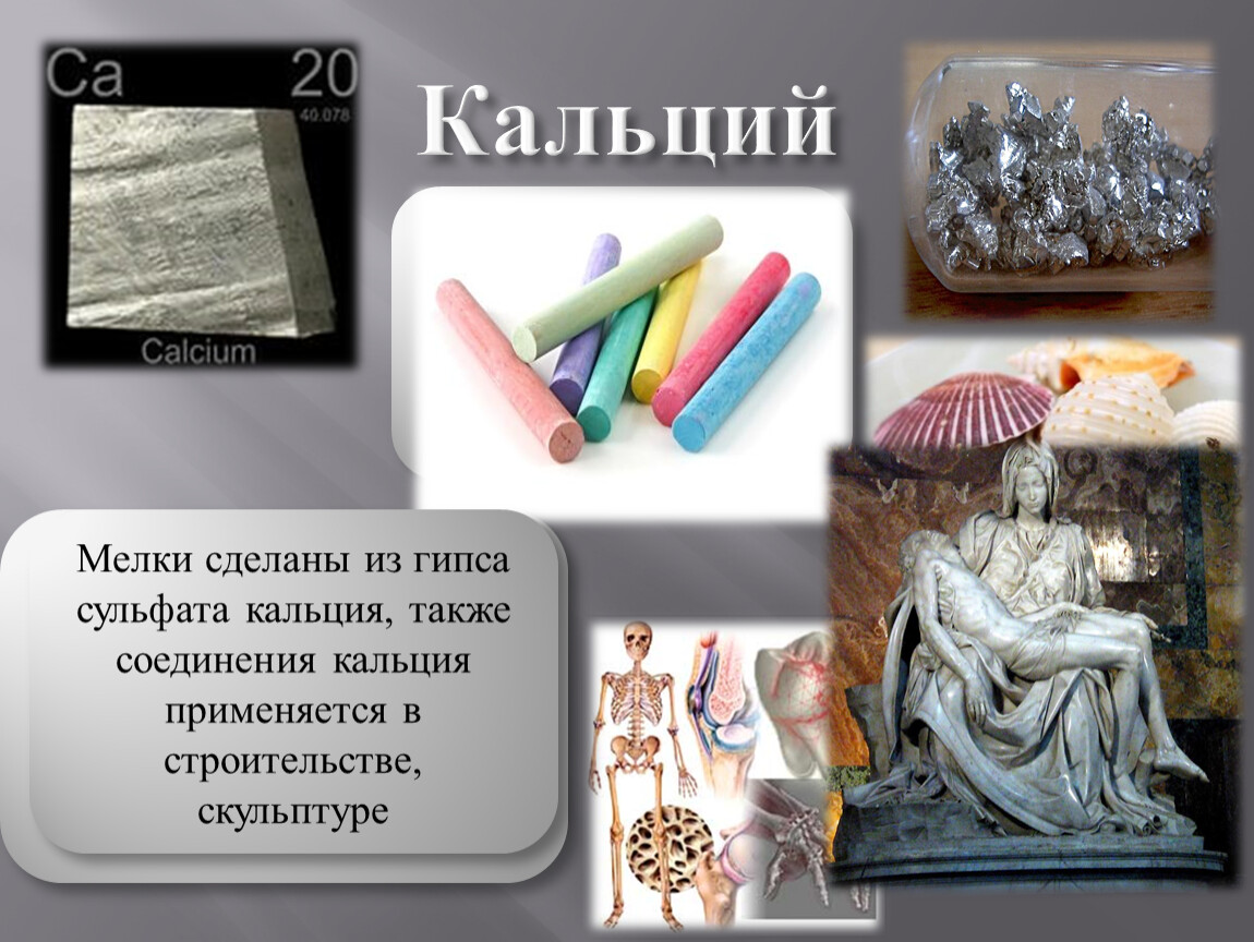 Мелки сделаны из гипса сульфата кальция, также соединения кальция применяется в строительстве,