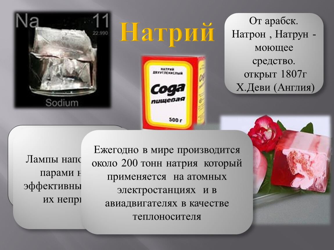 Натрий входит в состав поваренной соли, соды пищевой, производстве мыла и чистящих средств