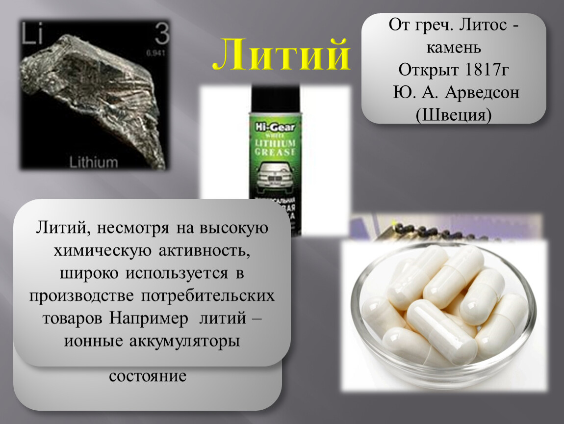 Соединения лития входит в состав смазок для автомобилей, лекарственных препаратов поддерживающих устойчивое эмоциональное состояние