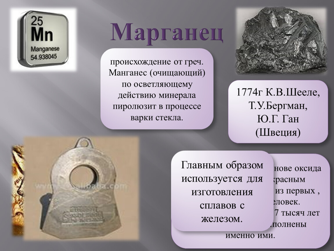 происхождение от греч. Манганес (очищающий) по осветляющему действию минерала пиролюзит в процессе варки стекла.