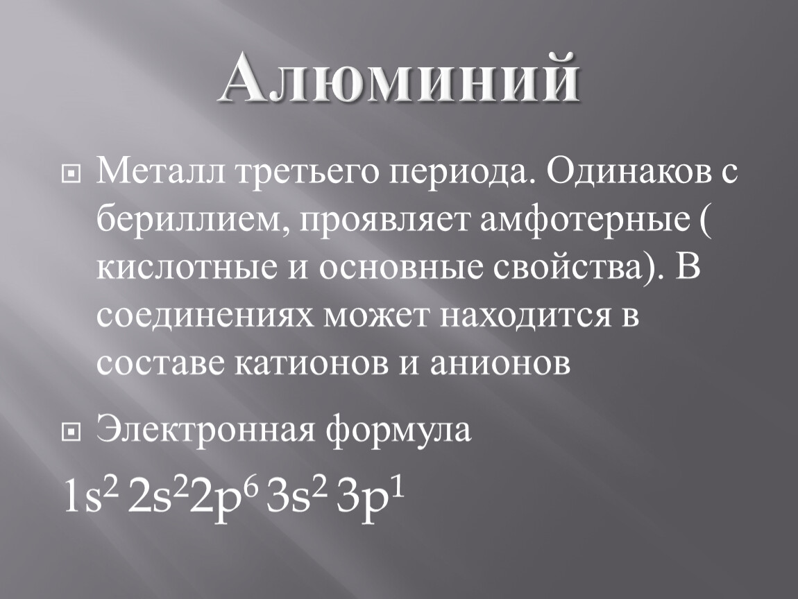 Металл третьего периода. Одинаков с бериллием, проявляет амфотерные ( кислотные и основные свойства). В соединениях может находится в составе катионов и анионов