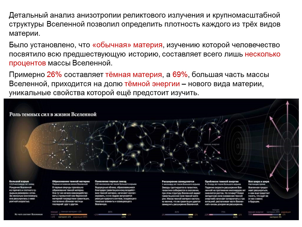 Детальный анализ анизотропии реликтового излучения и крупномасштабной структуры Вселенной позволил определить плотность каждого из трёх видов материи.