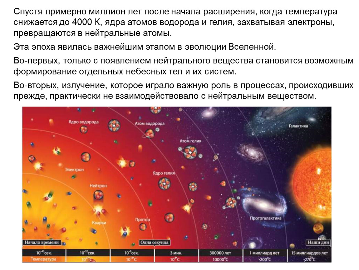 Во-первых, только с появлением нейтрального вещества становится возможным формирование отдельных небесных тел и их систем.