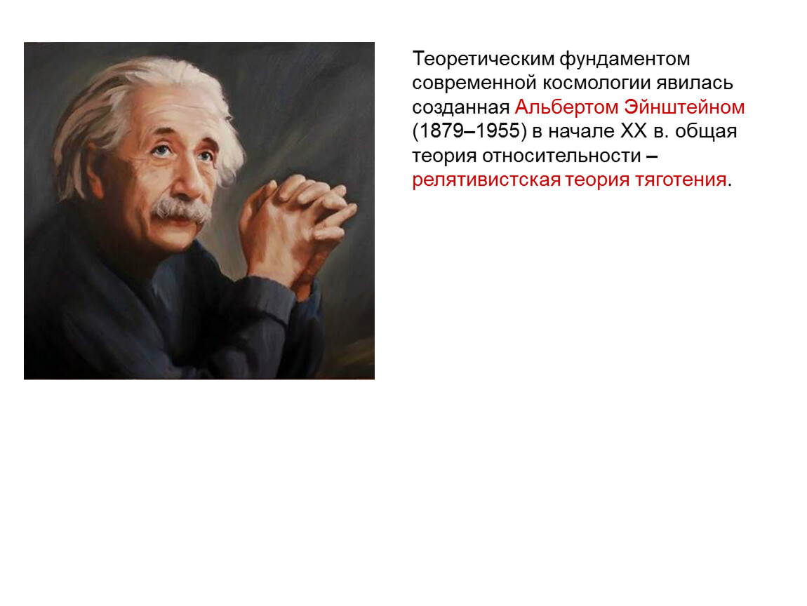 Теоретическим фундаментом современной космологии явилась созданная Альбертом Эйнштейном (1879–1955) в начале XX в. общая теория относительности – релятивистская теория тяготения.