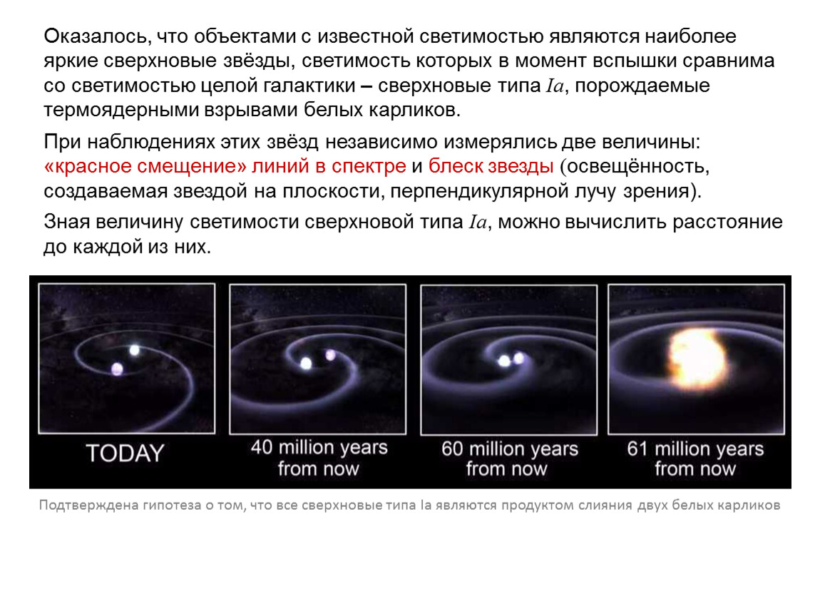 Оказалось, что объектами с известной светимостью являются наиболее яркие сверхновые звёзды, светимость которых в момент вспышки сравнима со светимостью целой галактики – сверхновые типа Ia, порождаемые термоядерными взрывами белых карликов.
