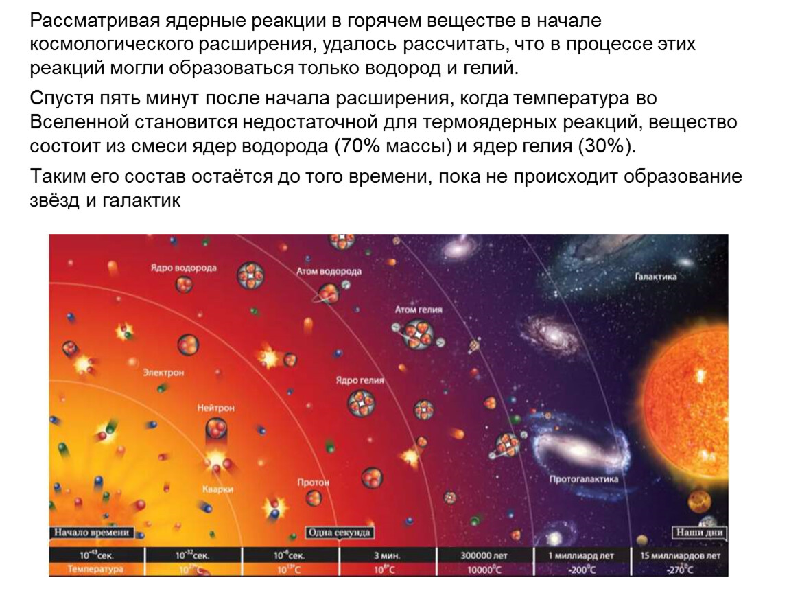 Спустя пять минут после начала расширения, когда температура во Вселенной становится недостаточной для термоядерных реакций, вещество состоит из смеси ядер водорода (70% массы) и ядер гелия (30%).