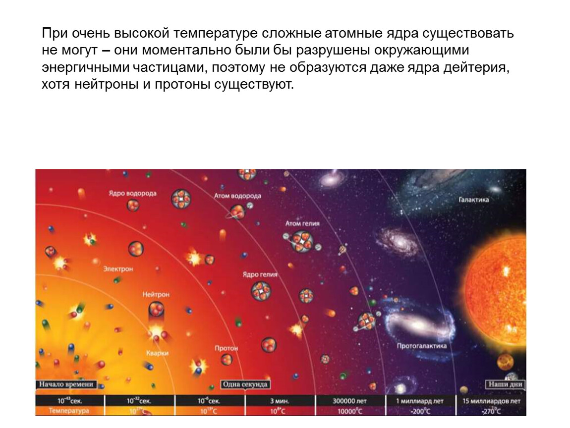 При очень высокой температуре сложные атомные ядра существовать не могут – они моментально были бы разрушены окружающими энергичными частицами, поэтому не образуются даже ядра дейтерия, хотя нейтроны и протоны существуют.