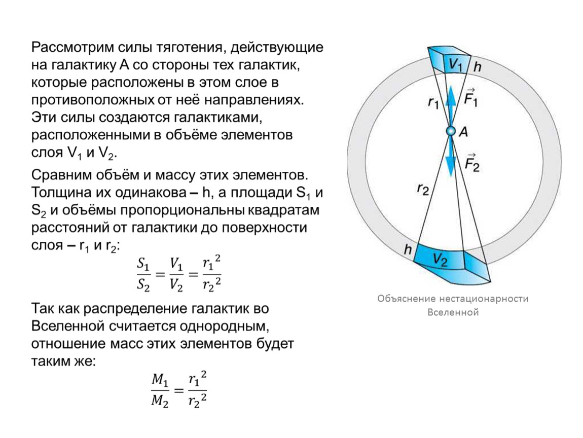 Для доказательства этого важного утверждения произвольно выделим во Вселенной шаровой слой толщиной h такого радиуса, чтобы внутри него оказались не только галактика A, но и весь шар радиусом R.