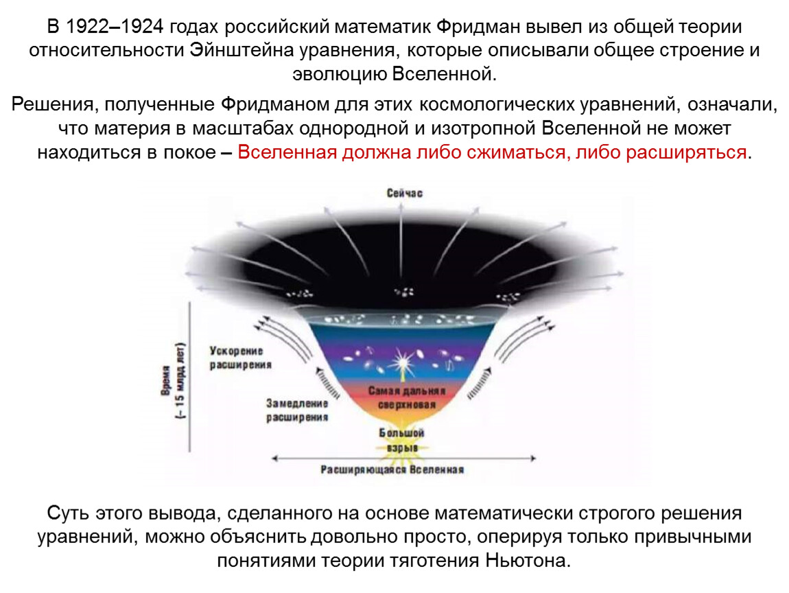 В 1922–1924 годах российский математик Фридман вывел из общей теории относительности Эйнштейна уравнения, которые описывали общее строение и эволюцию Вселенной.