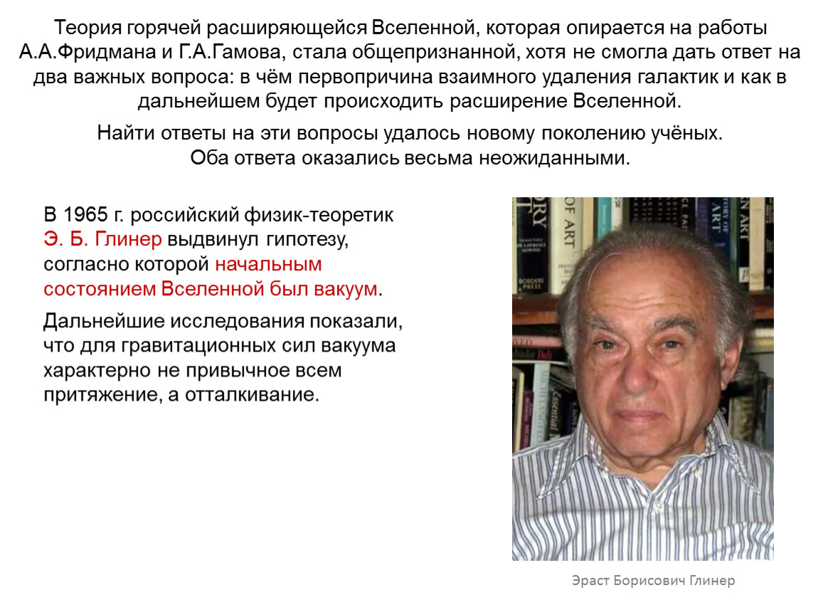 Теория горячей расширяющейся Вселенной, которая опирается на работы А.А.Фридмана и Г.А.Гамова, стала общепризнанной, хотя не смогла дать ответ на два важных вопроса: в чём первопричина взаимного удаления галактик и как в дальнейшем будет происходить расширение Вселенной.