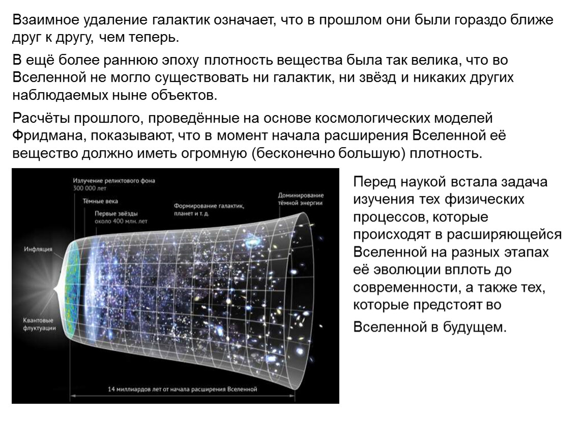 Открытие Хабблом «красного смещения» и работы Фридмана, показавшего, что Вселенная не может быть стационарной, явились только началом исследований эволюции Вселенной.