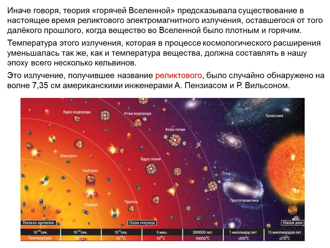 Иначе говоря, теория «горячей Вселенной» предсказывала существование в настоящее время реликтового электромагнитного излучения, оставшегося от того далёкого прошлого, когда вещество во Вселенной было плотным и горячим.