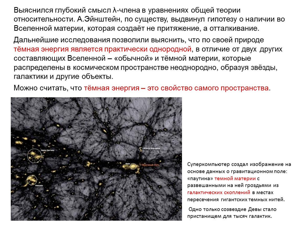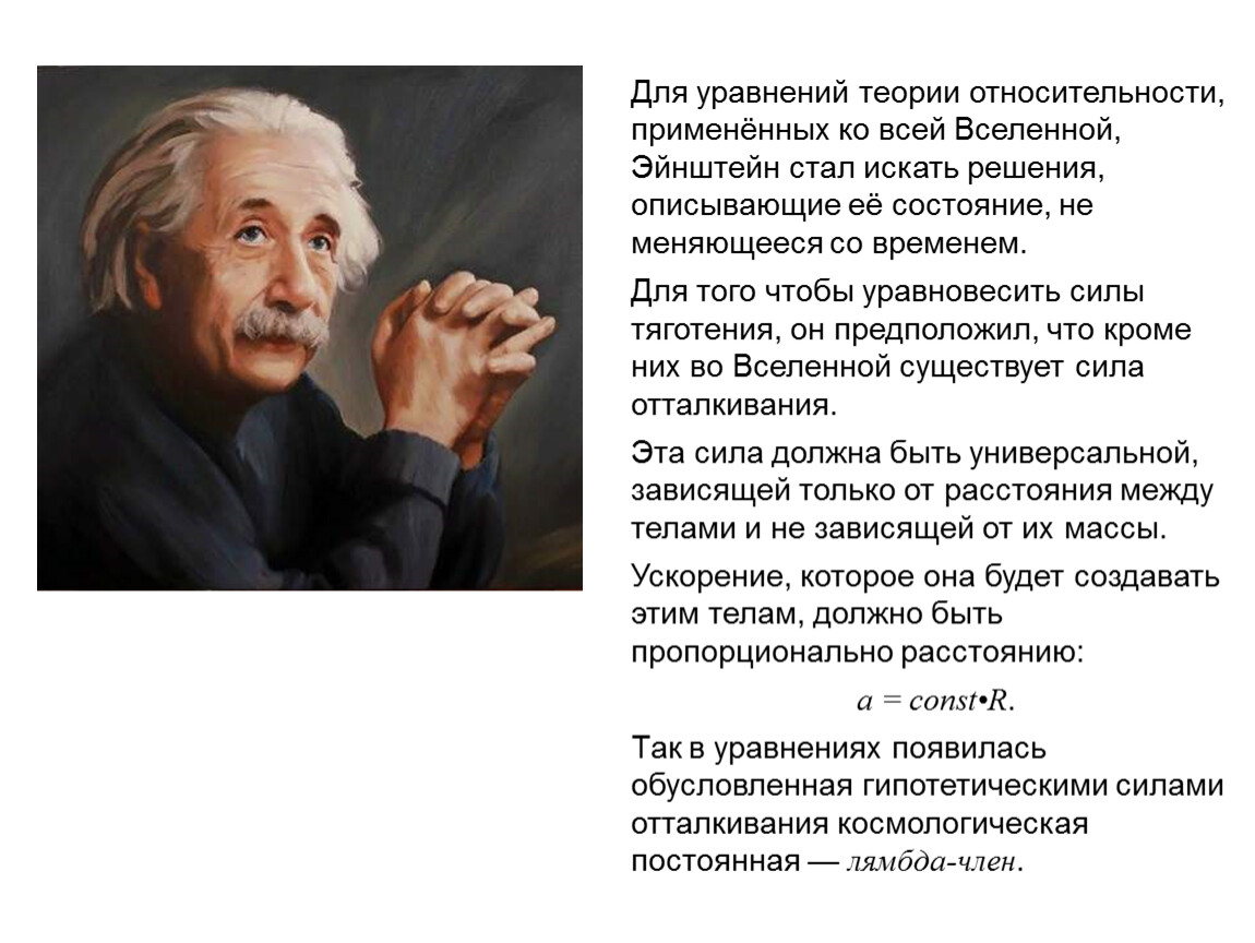 Выяснился глубокий смысл λ-члена в уравнениях общей теории относительности. А.Эйнштейн, по существу, выдвинул гипотезу о наличии во Вселенной материи, которая создаёт не притяжение, а отталкивание.