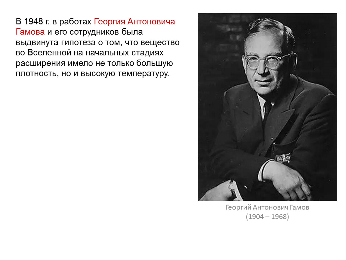 В 1948 г. в работах Георгия Антоновича Гамова и его сотрудников была выдвинута гипотеза о том, что вещество во Вселенной на начальных стадиях расширения имело не только большую плотность, но и высокую температуру.