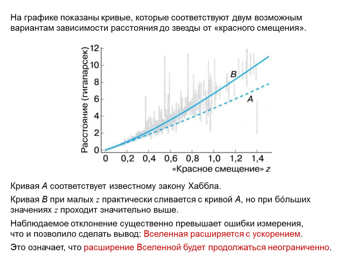 Чтобы ответить на вопрос, как в дальнейшем будет происходить расширение Вселенной, необходимо было установить зависимость скорости удаления галактики от расстояния до неё.