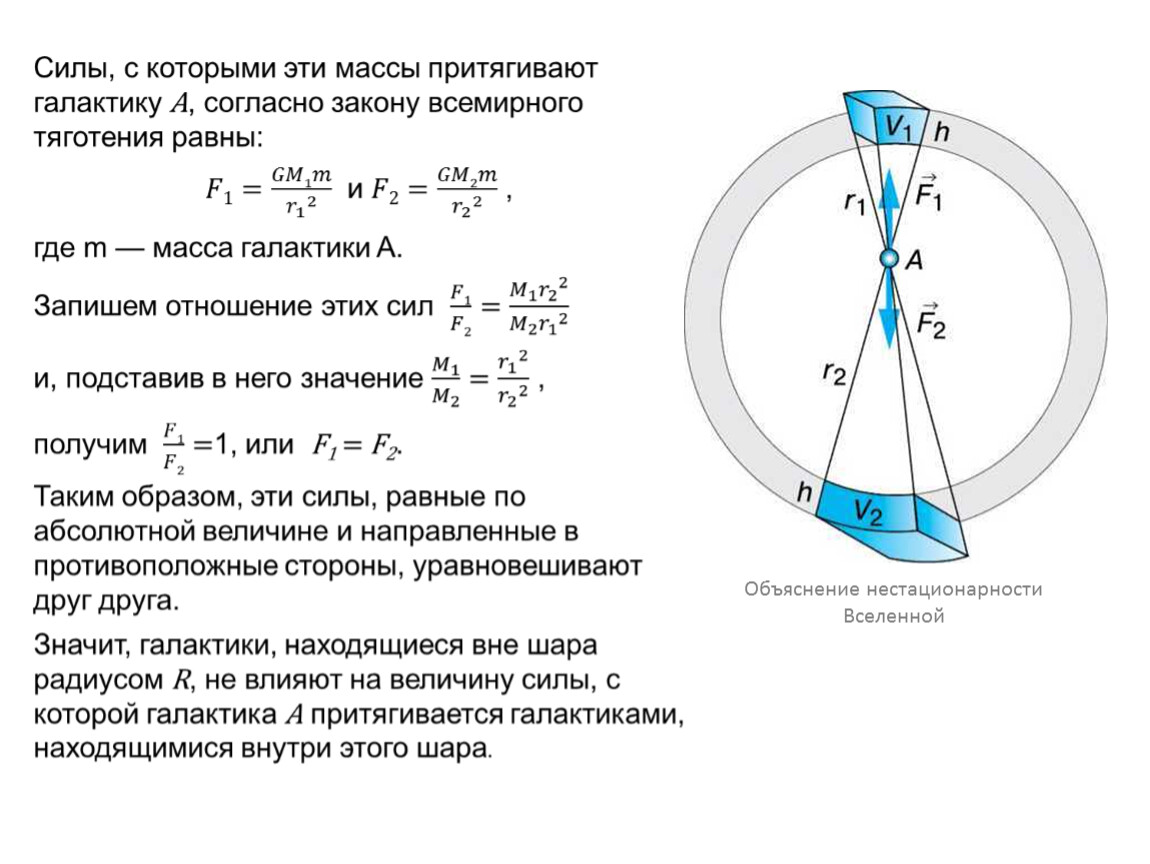 Тогда галактика, которая находится на поверхности шара произвольного радиуса, притягивается к его центру согласно закону всемирного тяготения с силой, прямо пропорциональной массе шара M и обратно пропорциональной квадрату его радиуса R.