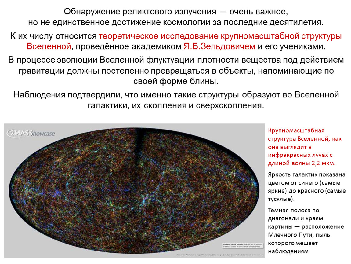 К их числу относится теоретическое исследование крупномасштабной структуры Вселенной, проведённое академиком Я.Б.Зельдовичем и его учениками.