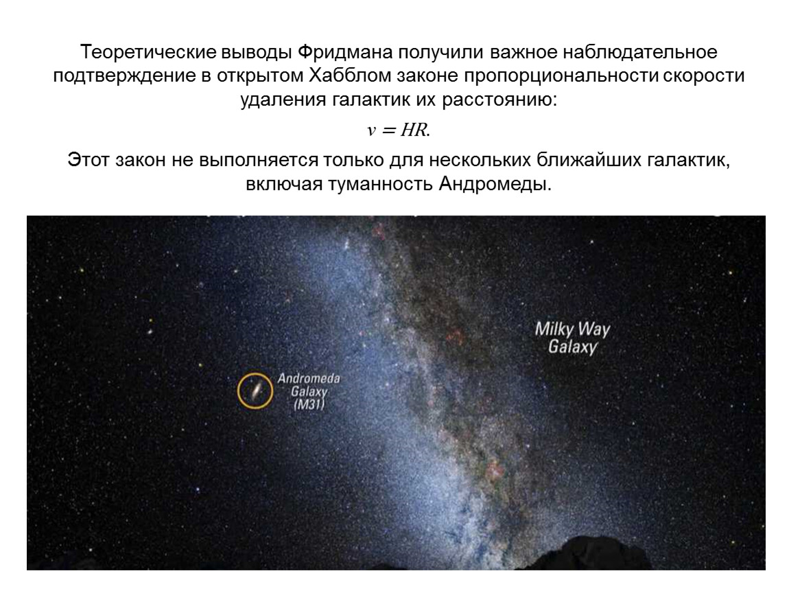 Теоретические выводы Фридмана получили важное наблюдательное подтверждение в открытом Хабблом законе пропорциональности скорости удаления галактик их расстоянию: