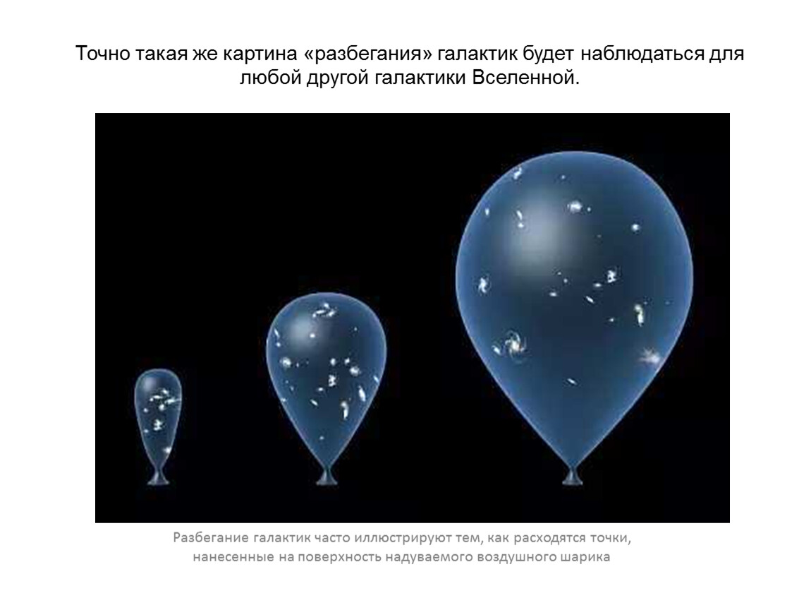 Точно такая же картина «разбегания» галактик будет наблюдаться для любой другой галактики Вселенной.