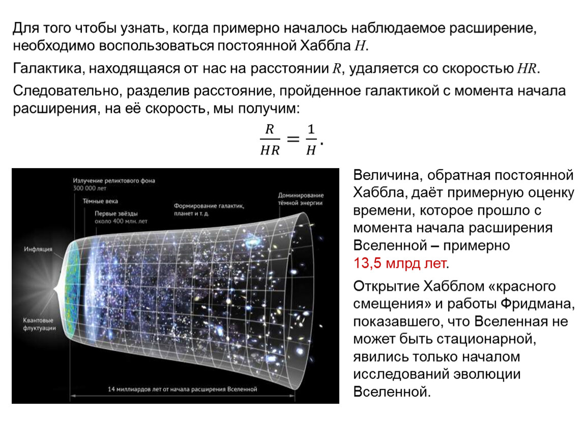 Величина, обратная постоянной Хаббла, даёт примерную оценку времени, которое прошло с момента начала расширения Вселенной – примерно 13,5 млрд лет.