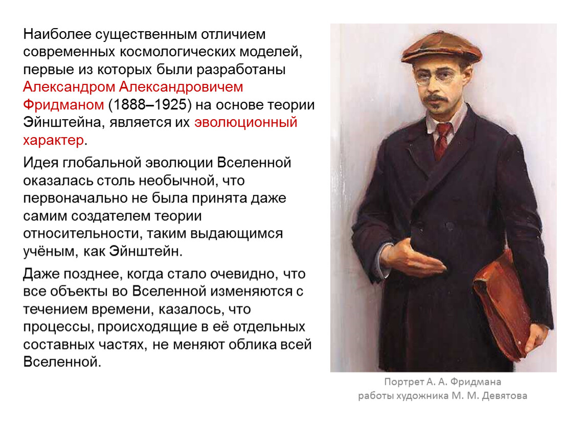 Наиболее существенным отличием современных космологических моделей, первые из которых были разработаны Александром Александровичем Фридманом (1888–1925) на основе теории Эйнштейна, является их эволюционный характер.