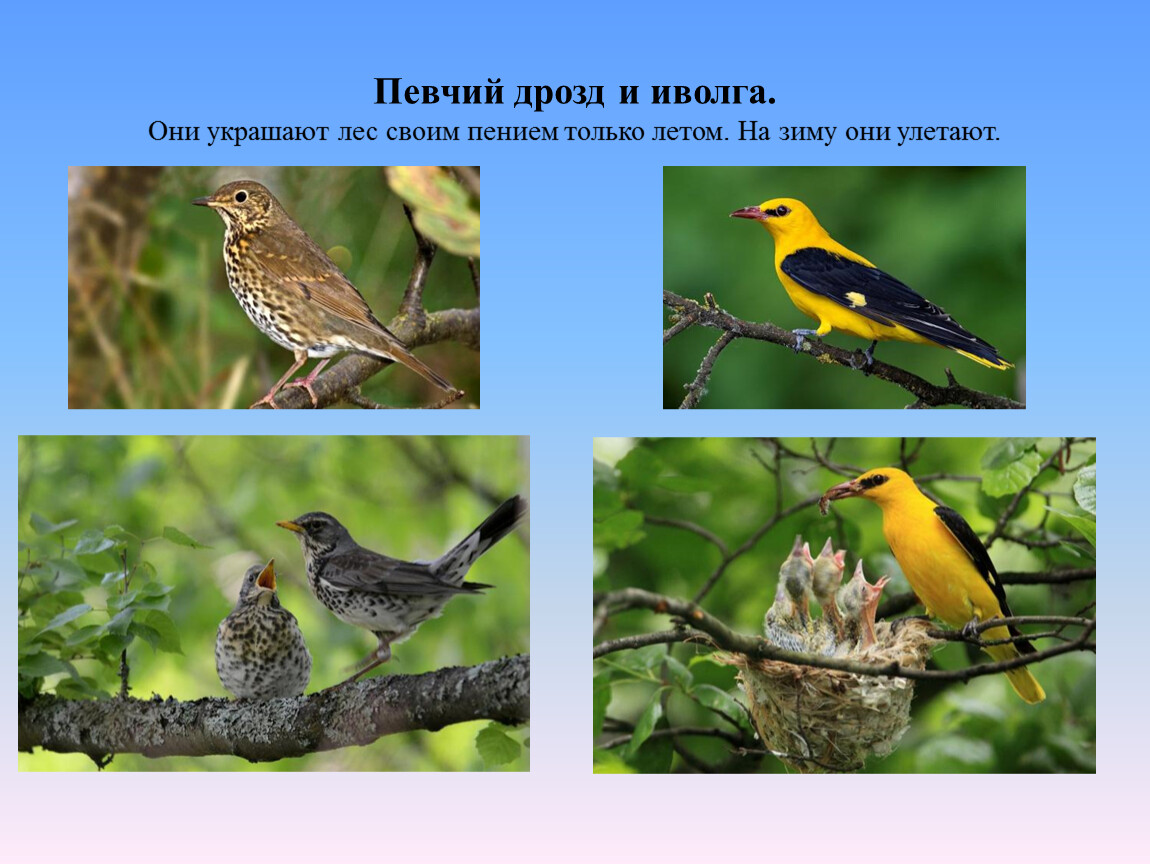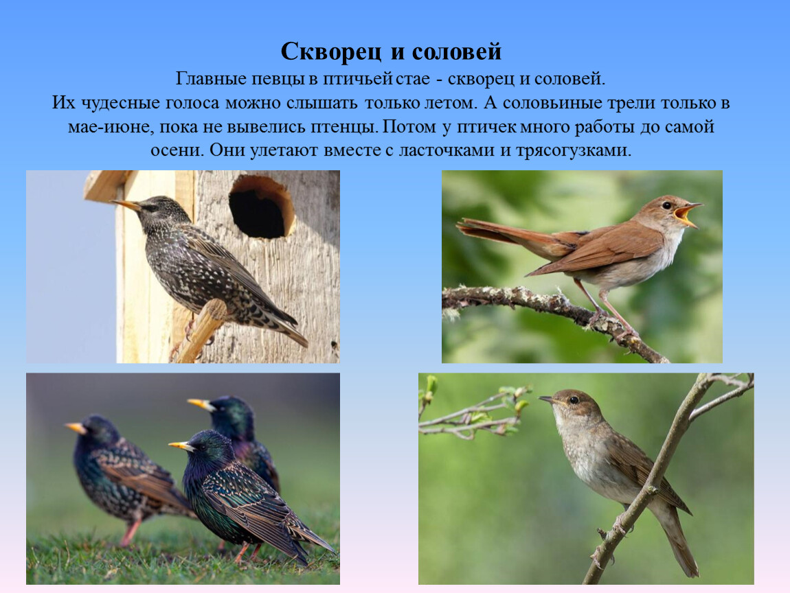 Скворец и соловейГлавные певцы в птичьей стае - скворец и соловей.Их чудесные голоса можно слышать только летом. А соловьиные трели только в мае-июне, пока не вывелись птенцы. Потом у птичек много работы до самой осени. Они улетают вместе с ласточками и трясогузками.