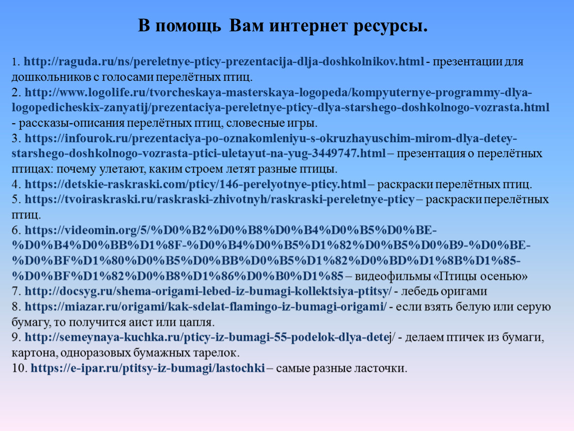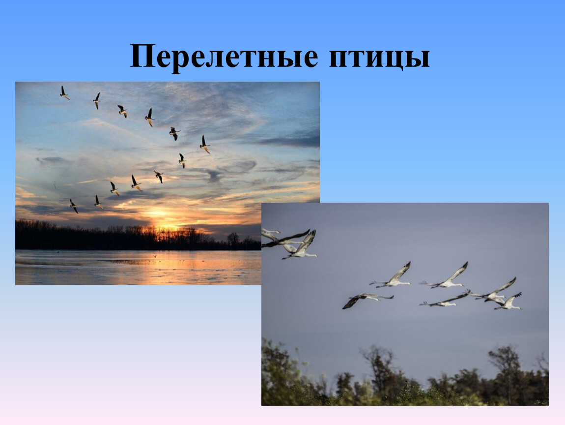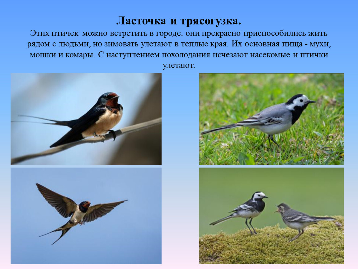 Ласточка и трясогузка.Этих птичек можно встретить в городе. они прекрасно приспособились жить рядом с людьми, но зимовать улетают в теплые края. Их основная пища - мухи, мошки и комары. С наступлением похолодания исчезают насекомые и птички улетают.