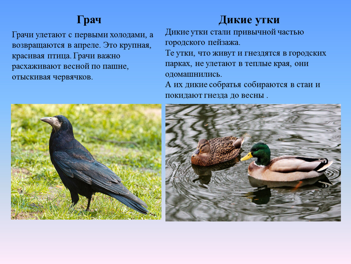 Грачи улетают с первыми холодами, а возвращаются в апреле. Это крупная, красивая птица. Грачи важно расхаживают весной по пашне, отыскивая червячков.
