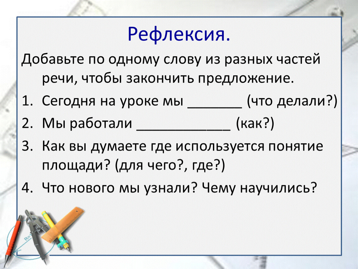 Как вы думаете где используется понятие площади? (для чего?, где?)