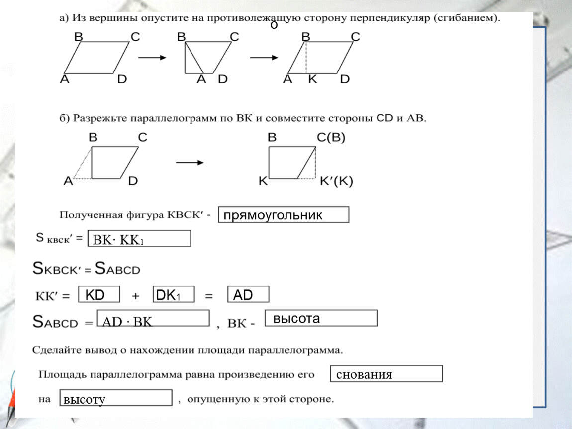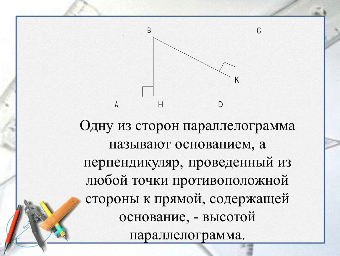 Одну из сторон параллелограмма называют основанием, а перпендикуляр, проведенный из любой точки противоположной стороны к прямой, содержащей основание, - высотой параллелограмма.