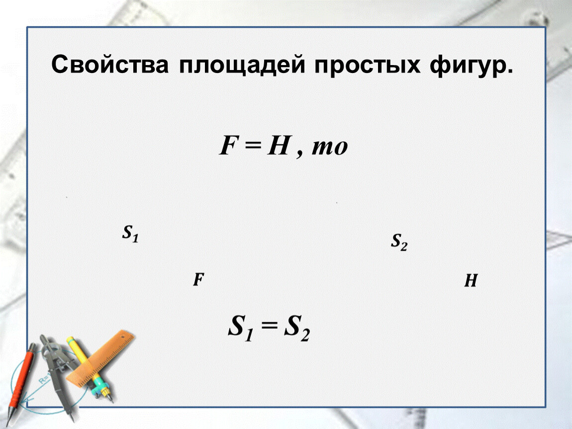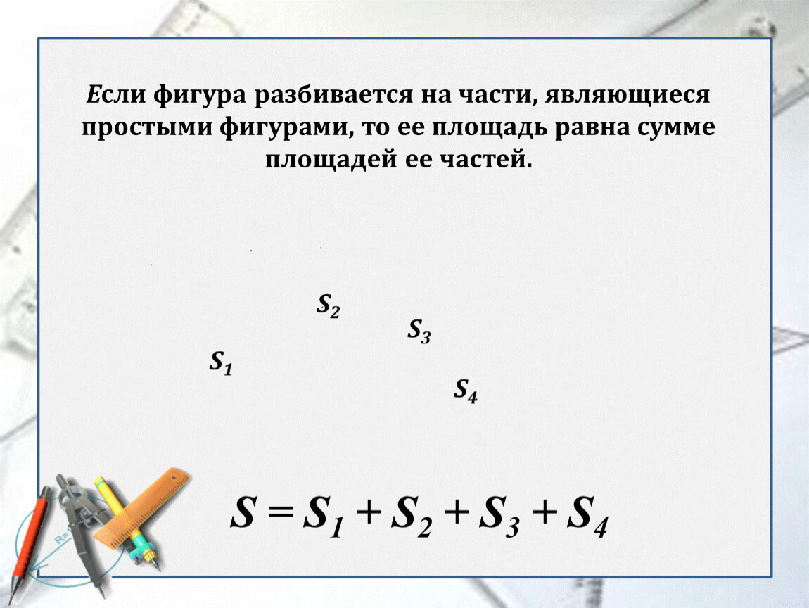 Если фигура разбивается на части, являющиеся простыми фигурами, то ее площадь равна сумме площадей ее частей.