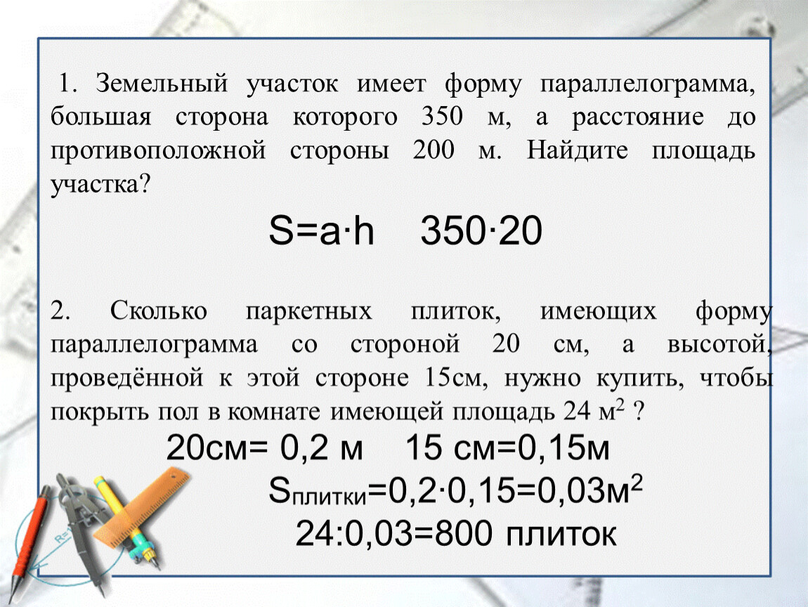 1. Земельный участок имеет форму параллелограмма, большая сторона которого 350 м, а расстояние до противоположной стороны 200 м. Найдите площадь участка?