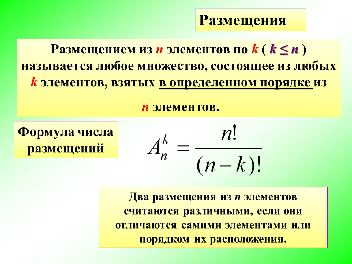 Размещением из n элементов по k ( k ≤ n ) называется любое множество, состоящее из любых k элементов, взятых в определенном порядке из