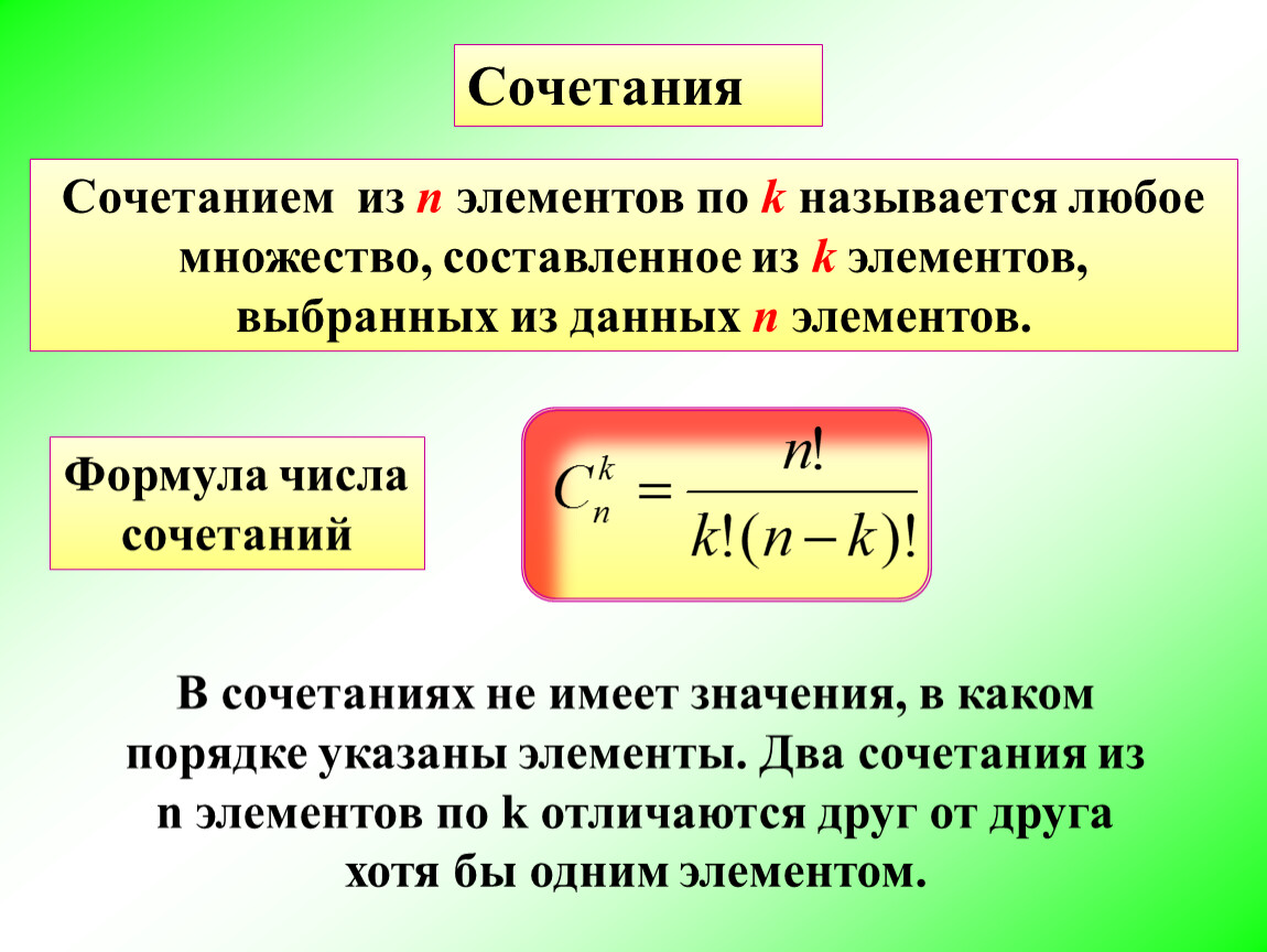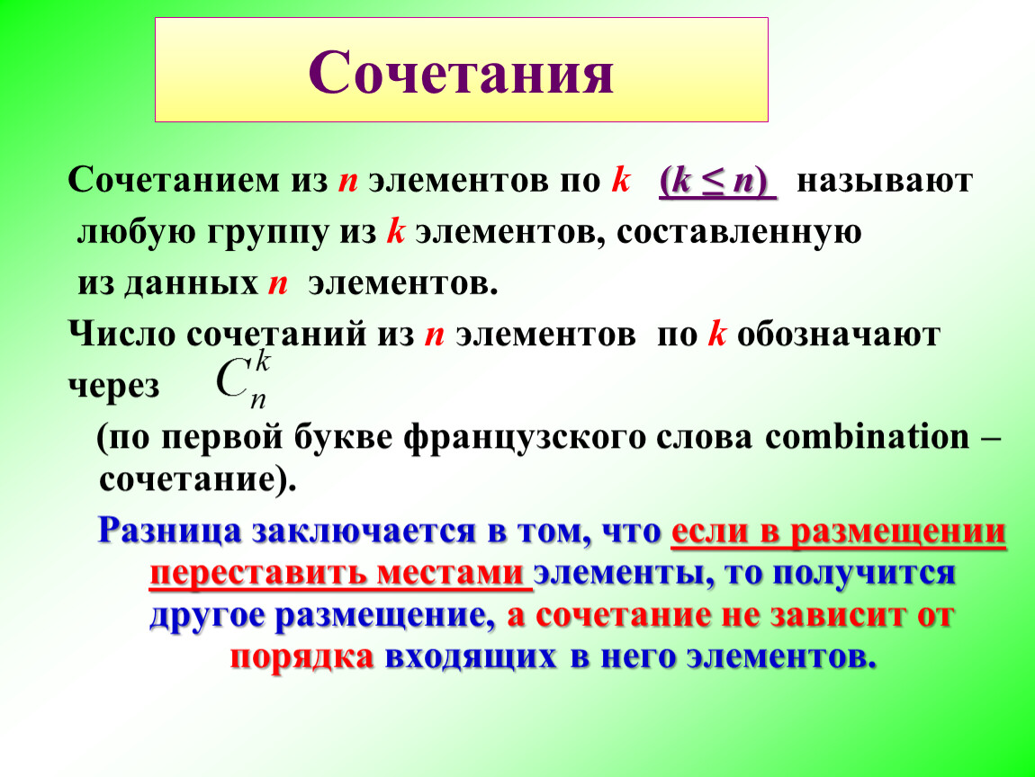 В сочетаниях не имеет значения, в каком порядке указаны элементы. Два сочетания из n элементов по k отличаются друг от друга хотя бы одним элементом.