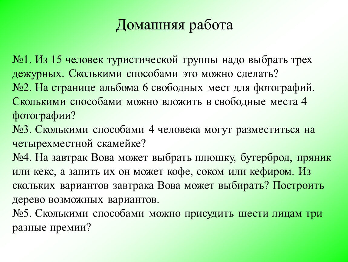 №1. Из 15 человек туристической группы надо выбрать трех дежурных. Сколькими способами это можно сделать?