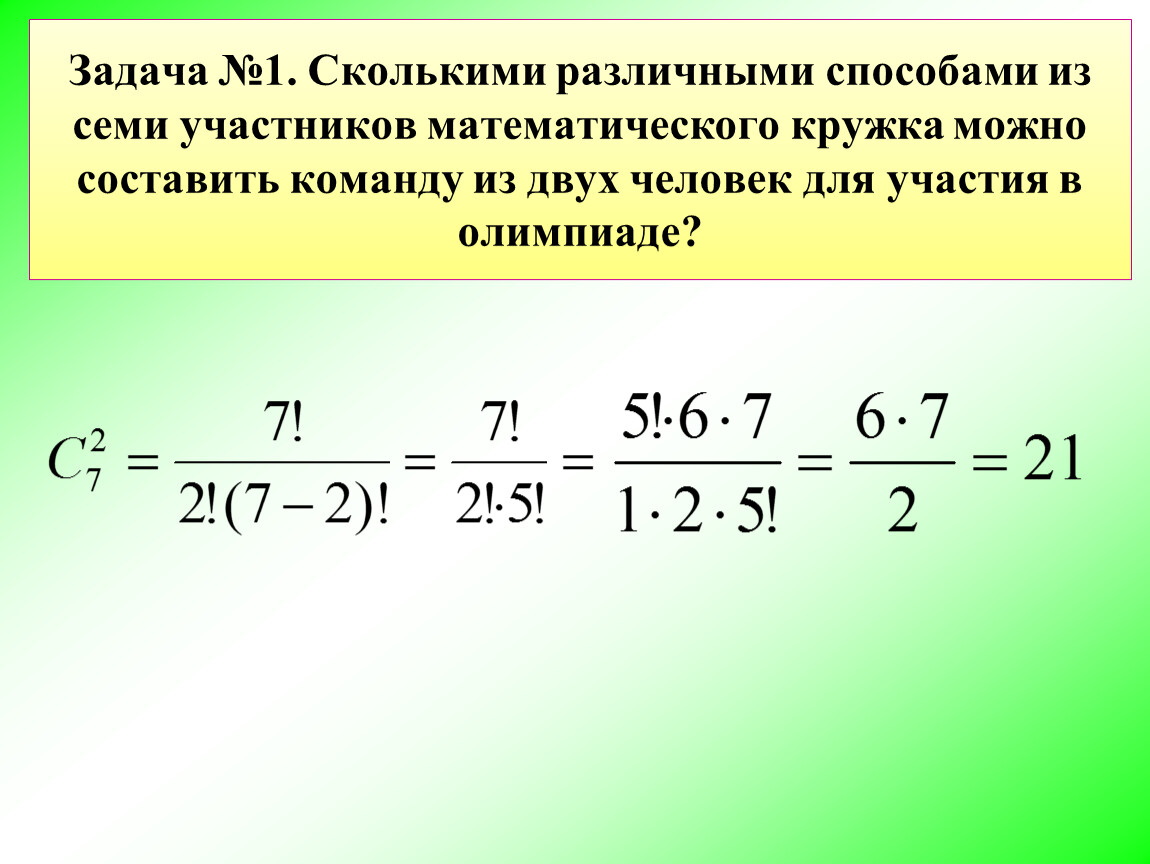 Задача №1. Сколькими различными способами из семи участников математического кружка можно составить команду из двух человек для участия в олимпиаде?