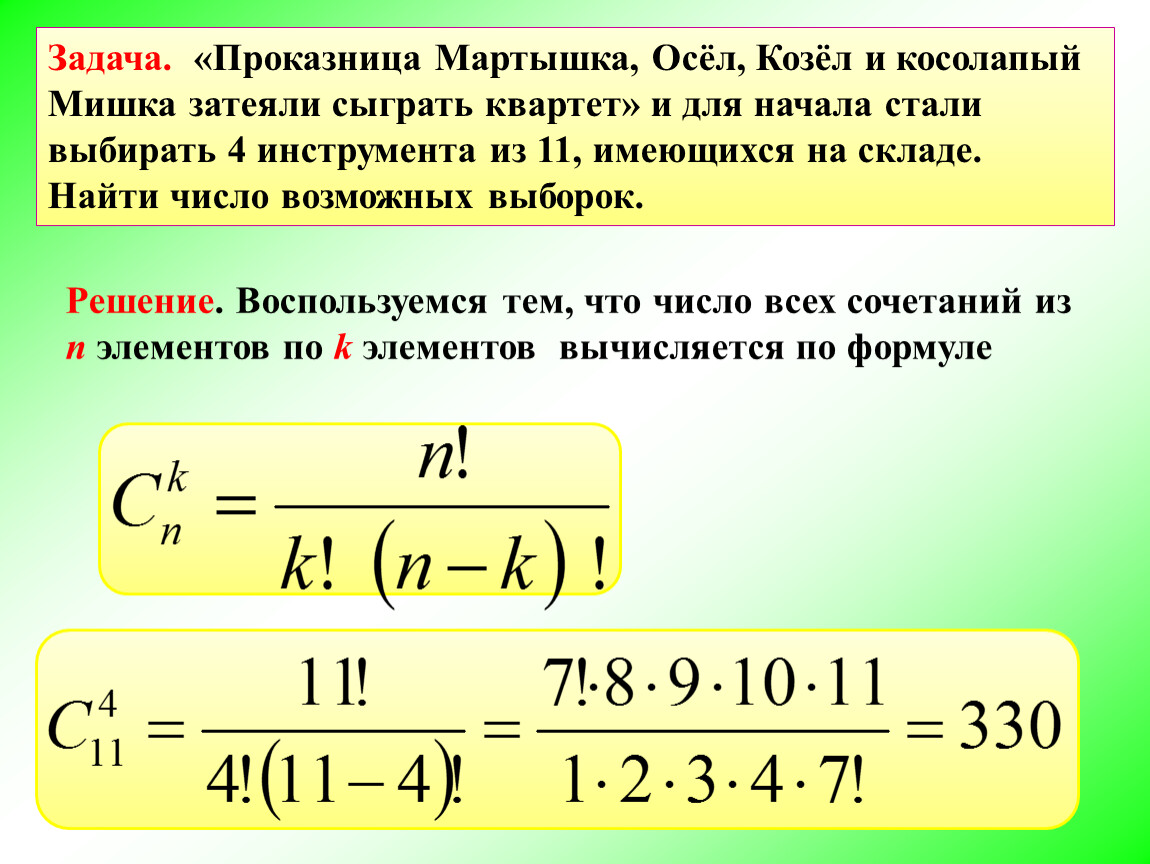 Сочетанием из n элементов по k называется любое множество, составленное из k элементов, выбранных из данных n элементов.