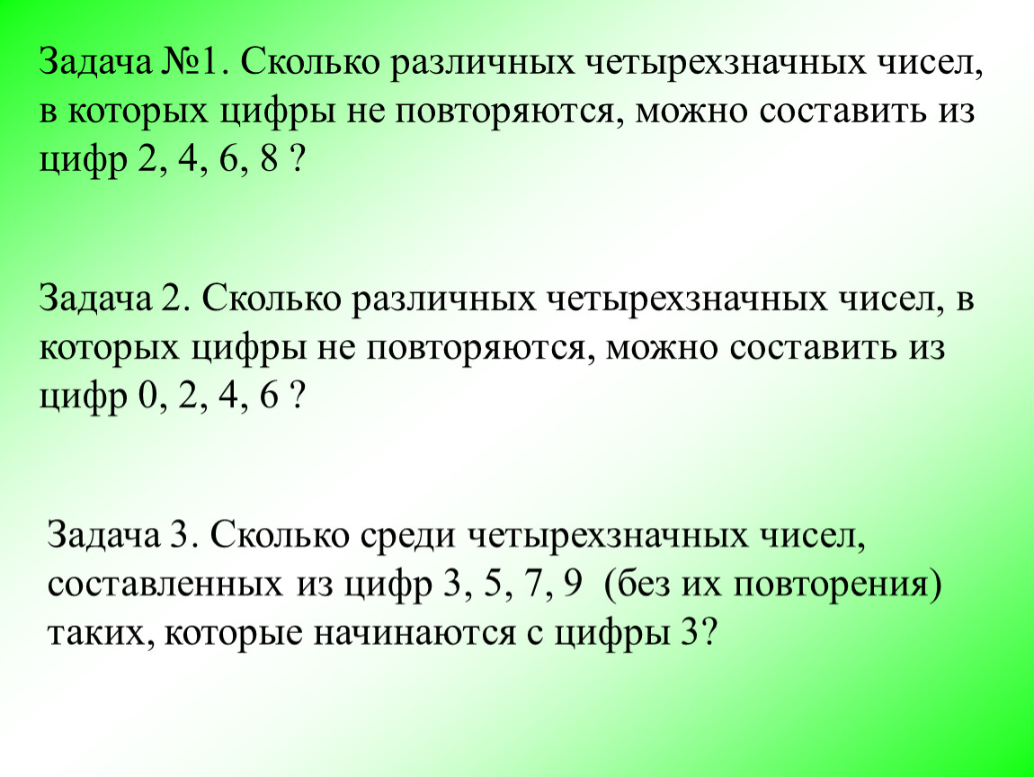 Задача №1. Сколько различных четырехзначных чисел, в которых цифры не повторяются, можно составить из цифр 2, 4, 6, 8 ?