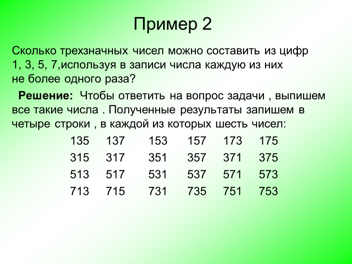 Сколько трехзначных чисел можно составить из цифр 1, 3, 5, 7,используя в записи числа каждую из них не более одного раза?