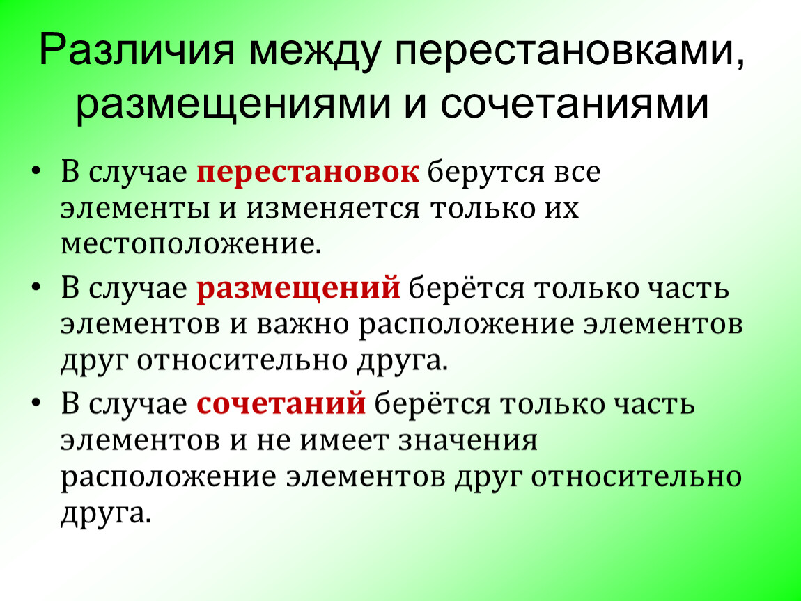Различия между перестановками, размещениями и сочетаниями