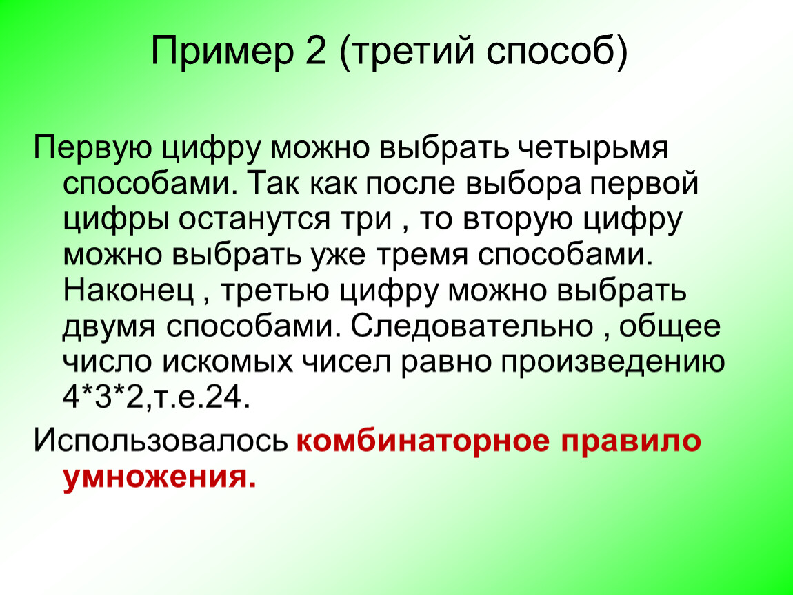 Первую цифру можно выбрать четырьмя способами. Так как после выбора первой цифры останутся три , то вторую цифру можно выбрать уже тремя способами. Наконец , третью цифру можно выбрать двумя способами. Следовательно , общее число искомых чисел равно произведению 4*3*2,т.е.24.