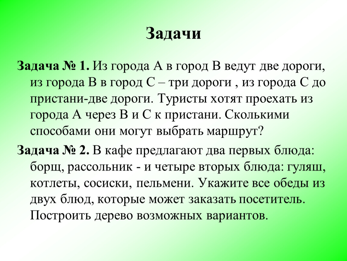 Задача № 1. Из города А в город В ведут две дороги, из города В в город С – три дороги , из города С до пристани-две дороги. Туристы хотят проехать из города А через В и С к пристани. Сколькими способами они могут выбрать маршрут?