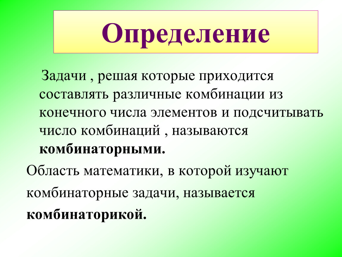Задачи , решая которые приходится составлять различные комбинации из конечного числа элементов и подсчитывать число комбинаций , называются комбинаторными.