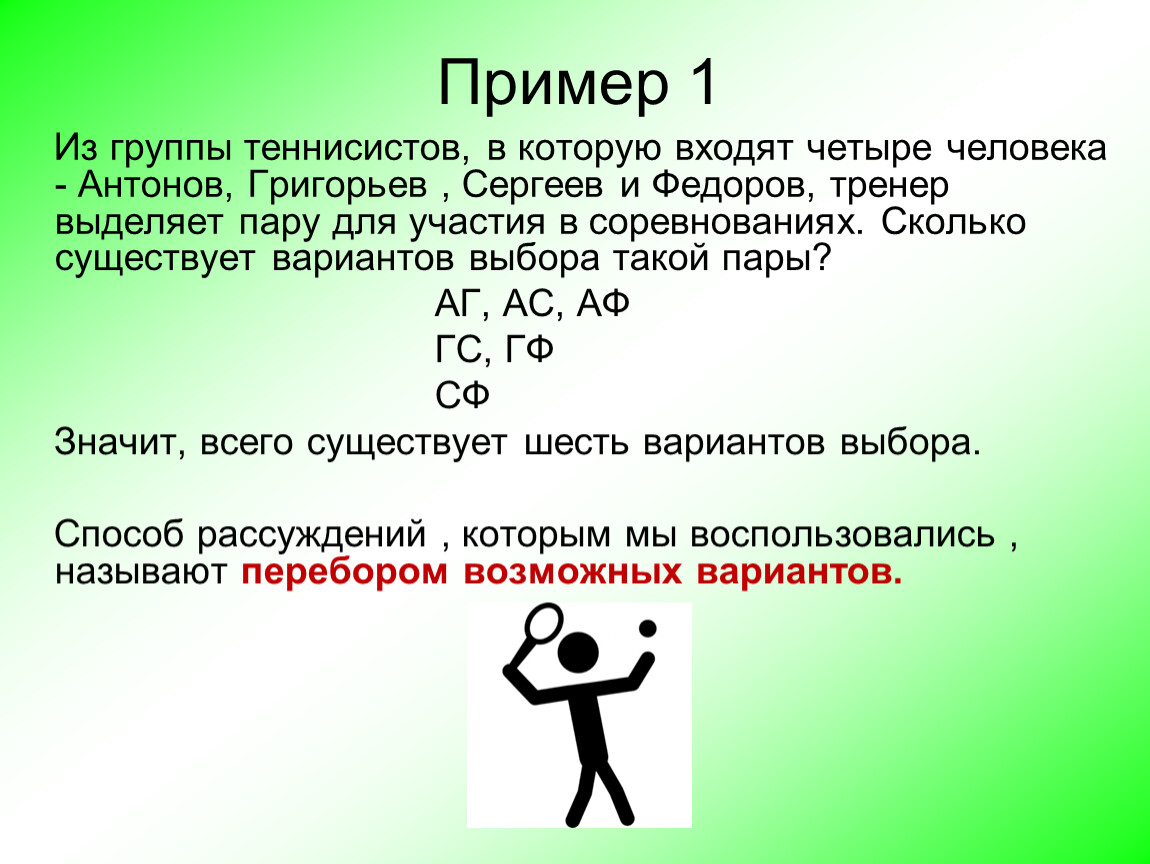 Способ рассуждений , которым мы воспользовались , называют перебором возможных вариантов.