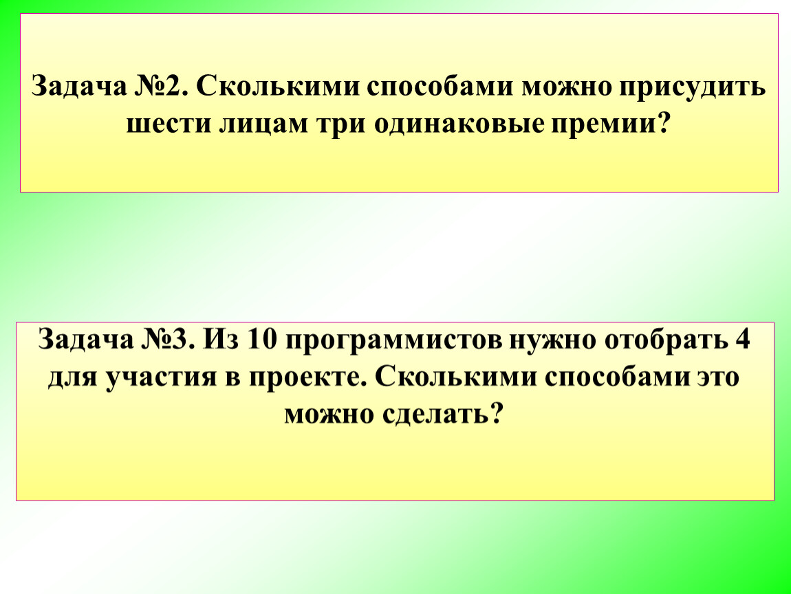Задача №2. Сколькими способами можно присудить шести лицам три одинаковые премии?